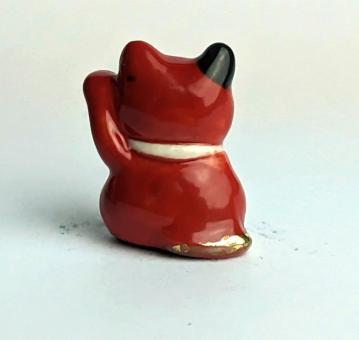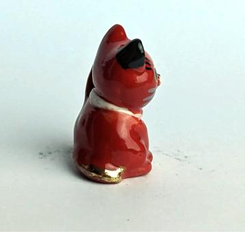 Rot, Gold, Schwarz und Weiß. Diese kunstvoll gestaltete Keramikfigur einer sitzenden roten "Winke Katze" ist ein echter Hingucker für jeden Katzenliebhaber und ein Glücksbringer in einem. Die Figur zeigt die Katze dabei, wie sie mit einer erhobenen Pfote winkt und mit einem rot-goldenen Halsband geschmückt ist.
