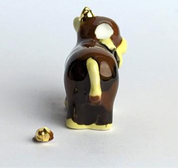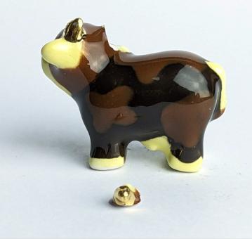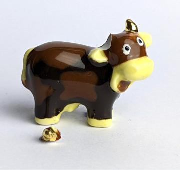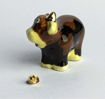 Sie suchen nach einer besonders glücklichen Ergänzung für Ihre Sammlung? Dann ist unsere handbemalte, goldene Keramikkuh mit einem breiten Grinsen und einem abgebrochenen Horn genau das Richtige für Sie! Mit einer Größe von nur 2 cm und in den Farben braun und dunkelbraun, ist sie der ultimative Hingucker in jedem Raum.