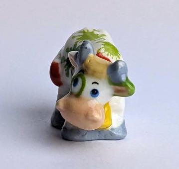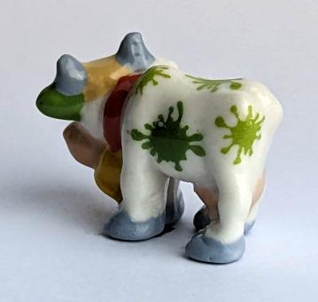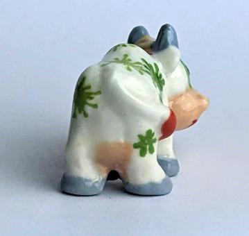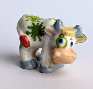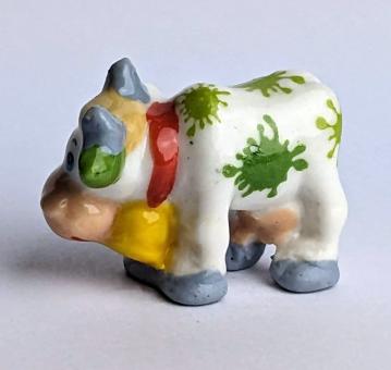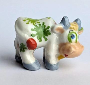 Diese entzückende, handbemalte Keramikfigur einer Kuh in hellrosa Farbe mit grünen Kleksen, einem roten Halsband und einem liebevollen Blick ist ein echter Hingucker für jeden Tierliebhaber. Mit einer Größe von nur 2 cm ist sie die perfekte Ergänzung für jede Sammlung oder als dekoratives Element in einem Regal oder auf einem Tisch.
